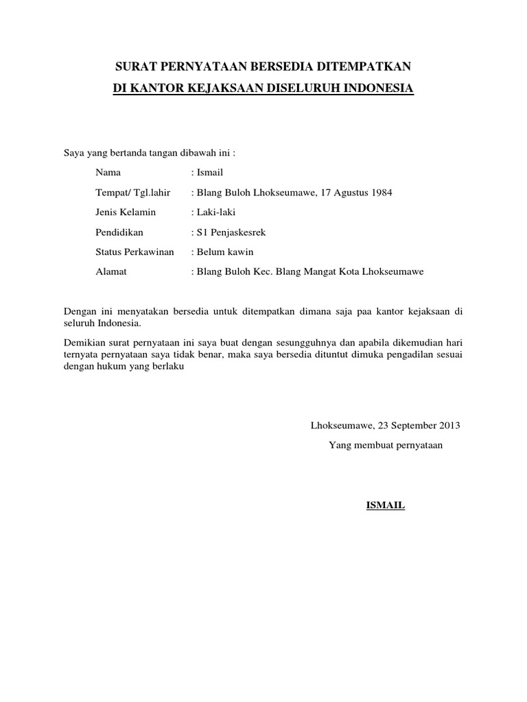 Contoh Surat Pernyataan Bersedia Ditempatkan Dimana Saja Cpns / Contoh Surat Pernyataan Siap Ditempatkan Dimana Saja Contoh Surat - Demikian ulasan tentang contoh surat pernyataan bersedia ditempatkan dimana saja.. 14+ contoh surat pernyataan : Contoh surat pernyataan bersedia ditempatkan dimana saja surat pernyataan perilaku yang masih tergolong normal, seperti pelanggaran anak sekolah. Surat pernyataan dari pelamar bermaterai rp. Silahkan simak terus situs ini karena disini saya akan mengupdate segala informasi terkait penerimaan cpns tahun 2018. Contoh surat pernyataan bersedia diempatkan di mana saja merupakan salah satu syarat yang harus dipenuhi ketika sedang mengirimkan surat lamaran kerja cpns 2017.